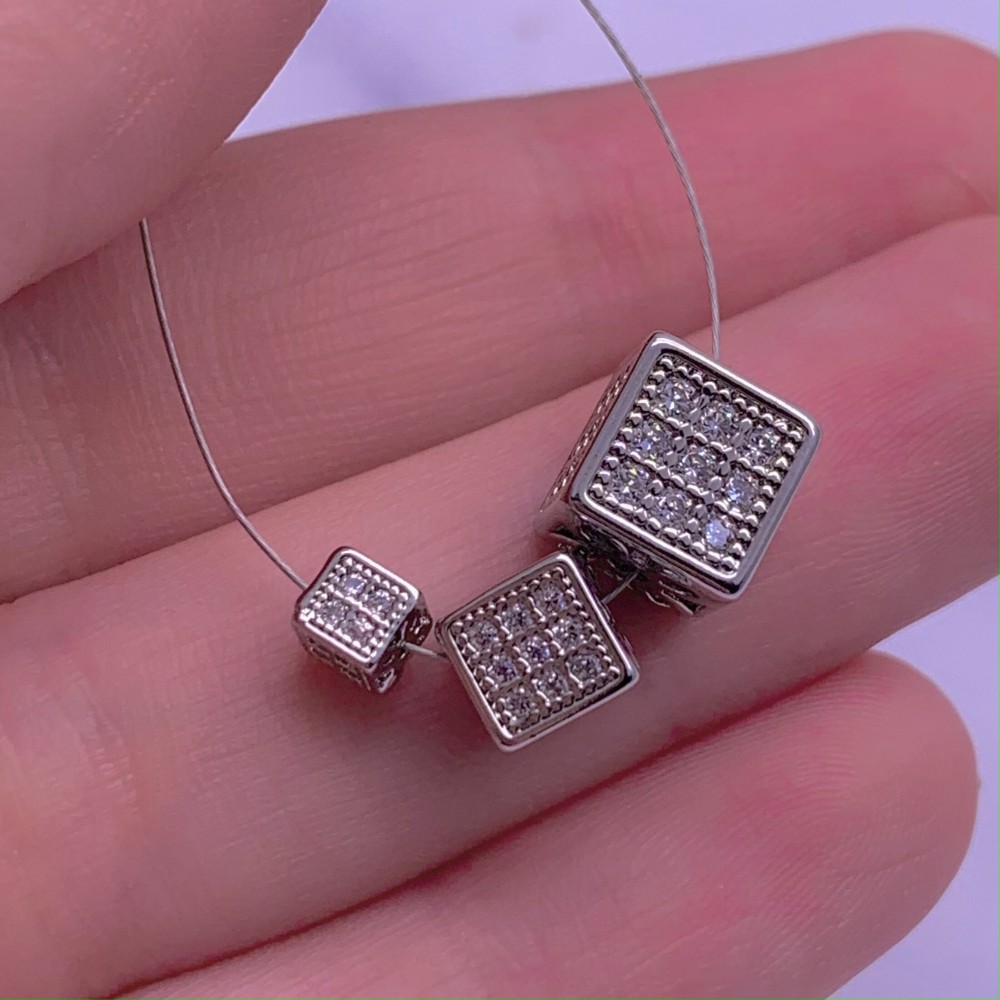 Бусина, кубик со стразами(цирконами), латунь, цвет родий(серебро), 8 мм