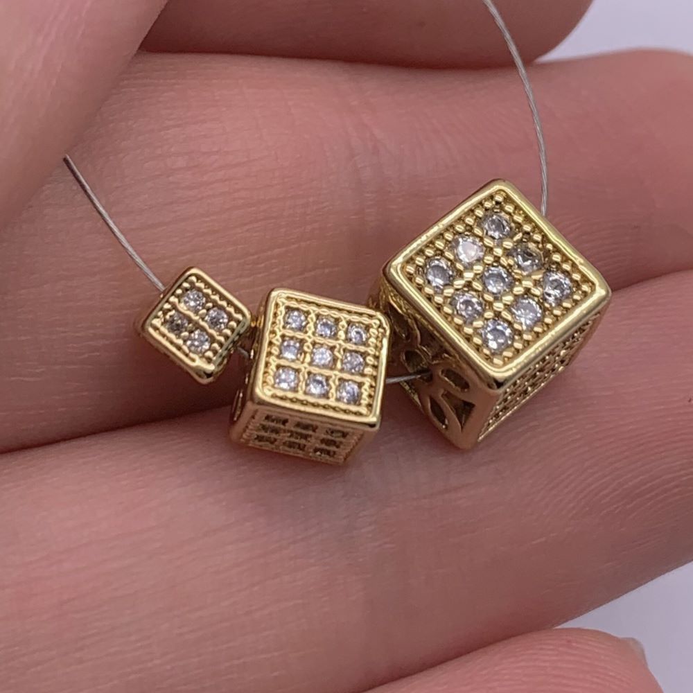 Бусина, кубик со стразами(цирконами), латунь, цвет золото, 4 мм
