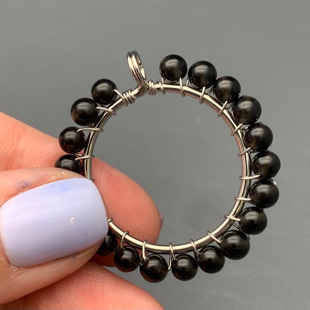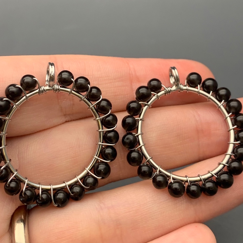 Материал - медный сплав, внешний диаметр - 35 мм, внутренний диаметр - 25 мм, по внешнему кругу  расположены 20 бусин черного агата размером 4 мм