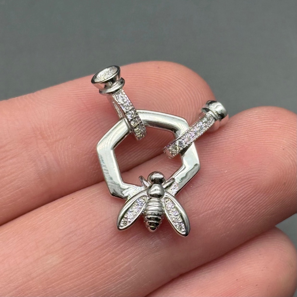 Замок, карабин, оса, с циркониями, с концевиками, модель SS 925, покрытие родий, размер 13 мм, общая длина 25х17 мм, цена за шт.