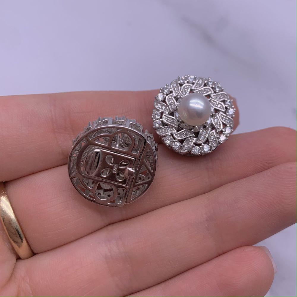 Замок, застёжка с кнопкой, декорирована жемчугом майорика, родированное серебро 925 пробы, 20х8 мм