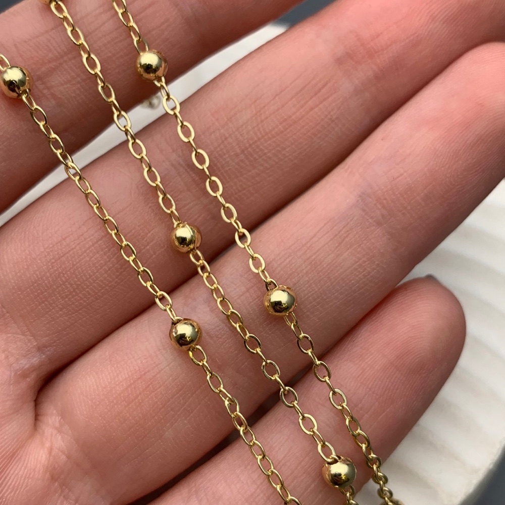 Теги: Цепь № 11, латунь, цвет золото, размер звена 2х1, 5 мм, шарик 3, 8 мм через каждые 28 мм, цена за 1 метр, 11398, Цепи ( метраж)