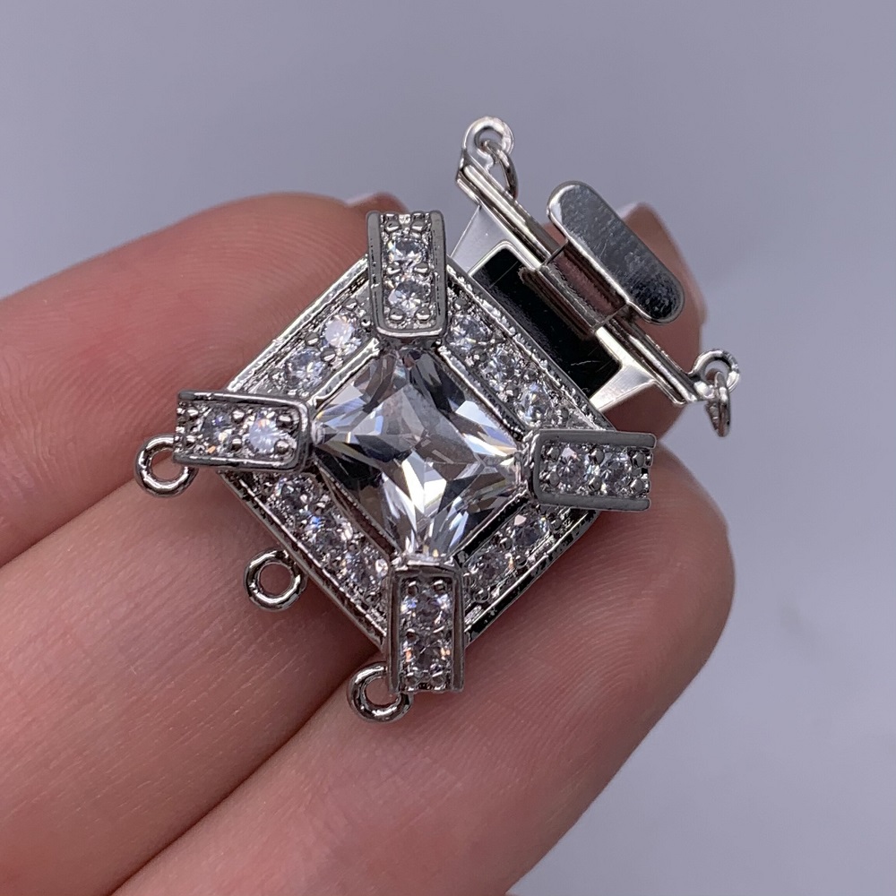 Застёжка, замочек многорядный, с фианитами, цвет родий, 19х17 мм