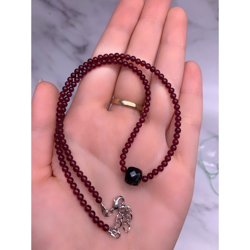 Чокер выполнен из гладкого Граната диаметром 3 мм, вставка - черный Турмалин, Шерл, кубик в ювелирной огранке размером 8 мм. Длина изделия вместе с замочком и удлинителем 44-45 см. Фурнитура с родиевым покрытием.