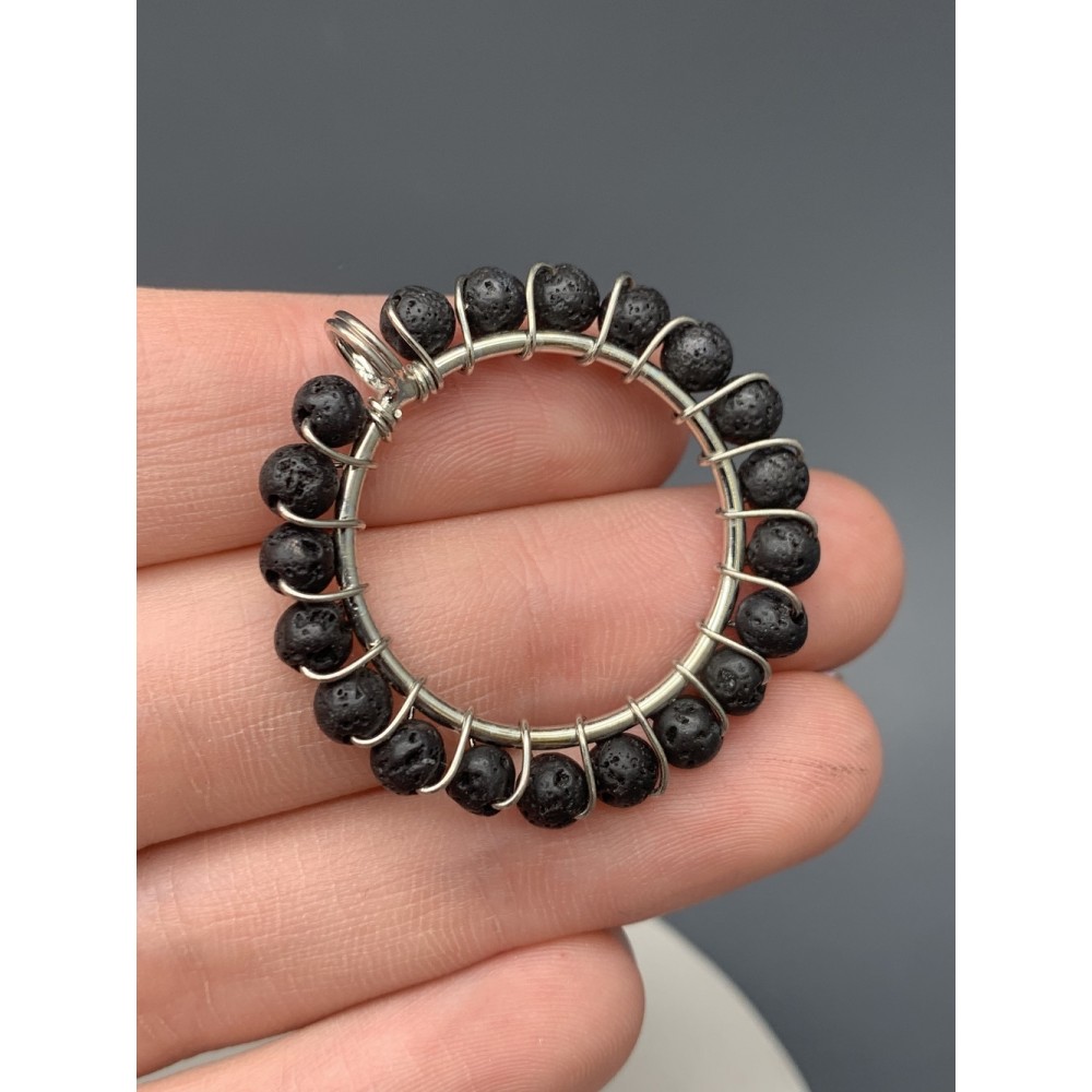 Материал - медный сплав, внешний диаметр - 37 мм, внутренний диаметр - 25 мм, по внешнему кругу  расположены 21 бусина вулканической черной лавы размером 4,5 мм