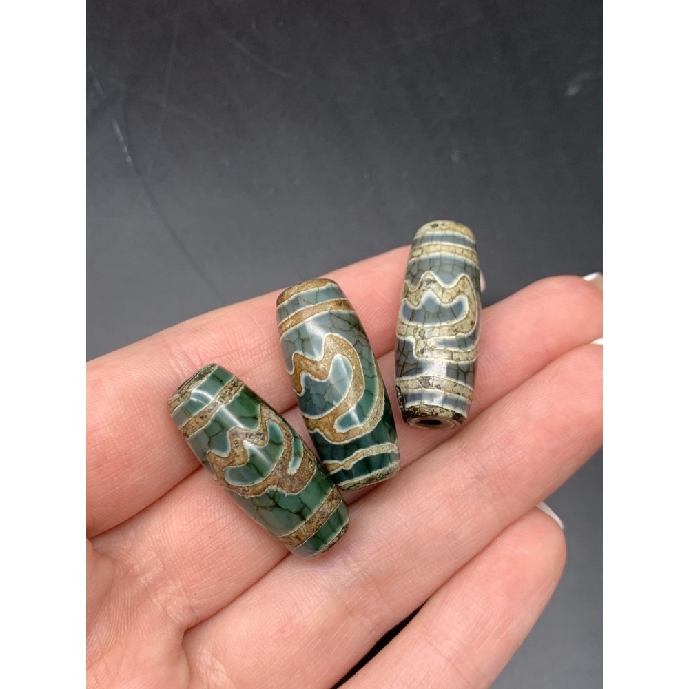 Бусина Дзи "333", Лотос, Агат, зелёный, тонированный, состаренный, кракле, 30х11 мм, цена за 1 бусину