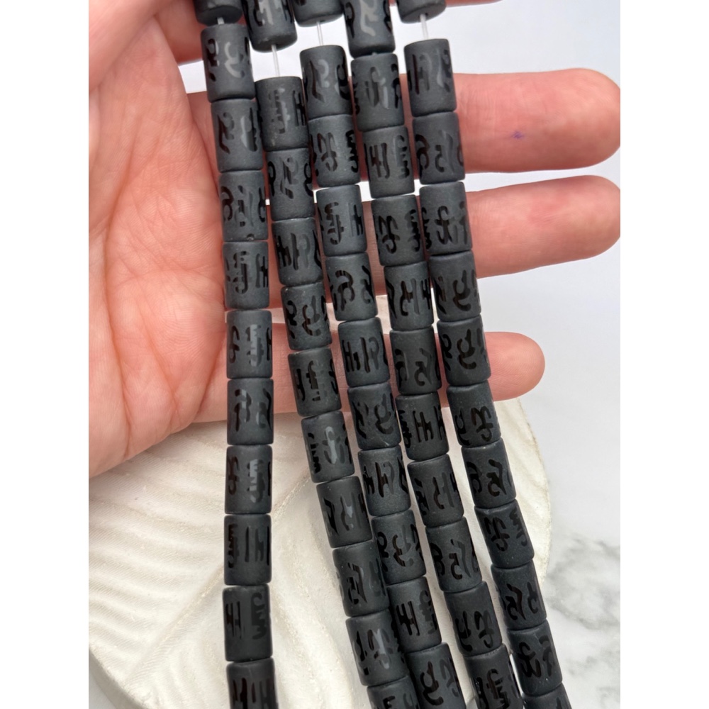 Каменные бусины, Агат черный, с мантрами, (любовь, счастье, здоровье, успех, богатство), трубочки (столбики), 8х12 мм, длина нити 39 см