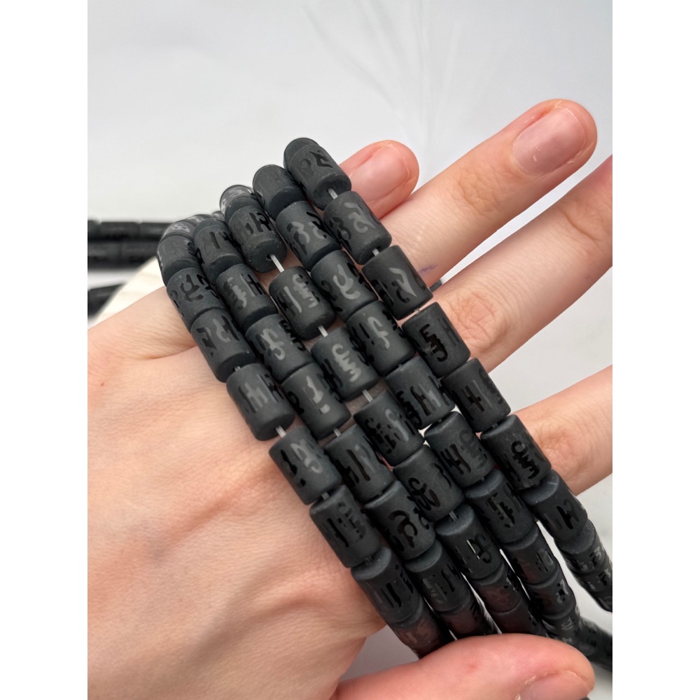 Каменные бусины, Агат черный, с мантрами, (любовь, счастье, здоровье, успех, богатство), трубочки (столбики), 8х12 мм, длина нити 39 см 0 750 ₽