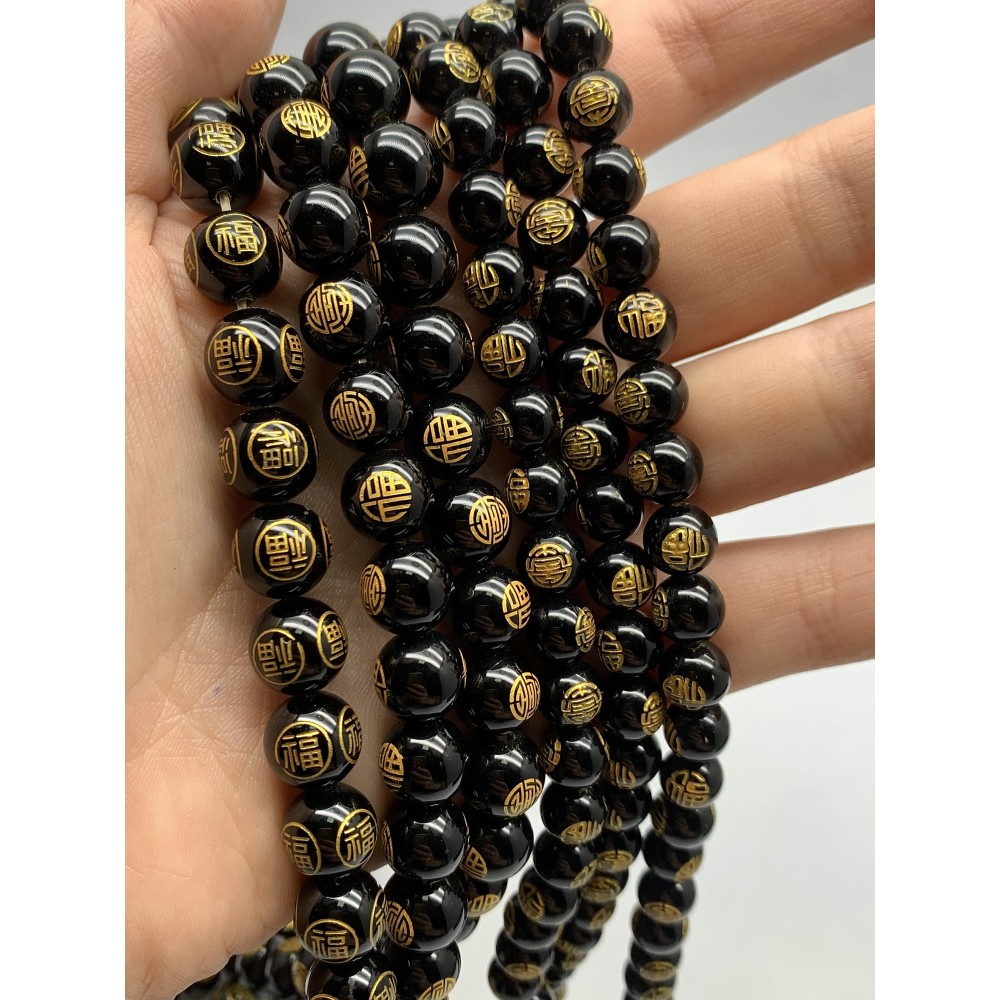 Каменные бусины, Мантры, Благословение, (Счастье, долголетие, успех, благополучие), Агат, чёрный, 10 мм, длина нити 38 см
