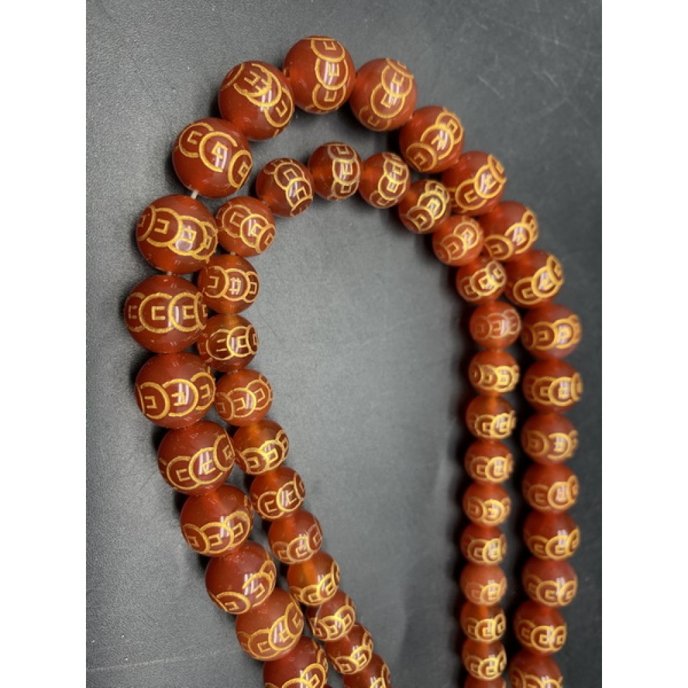 • Каменные бусины, Сердолик (Карнеол), Мантры, китайские монеты (символ богатства), 10 мм, длина нити 38 см
