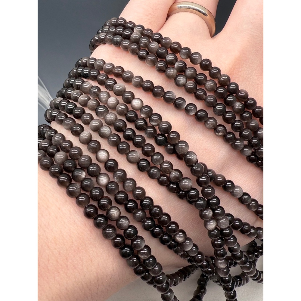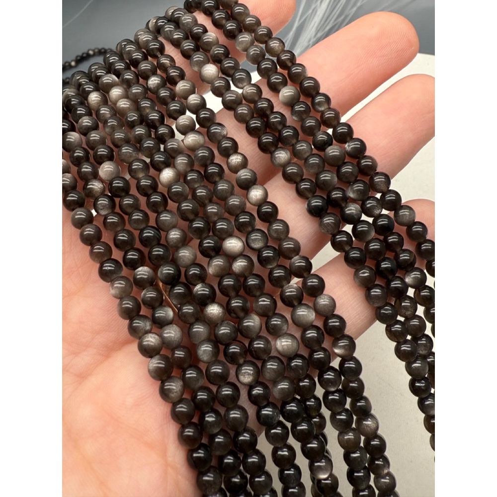 Каменные бусины, Обсидиан серебристый, люкс, шарик гладкий, 4 мм, длина нити 38 см
