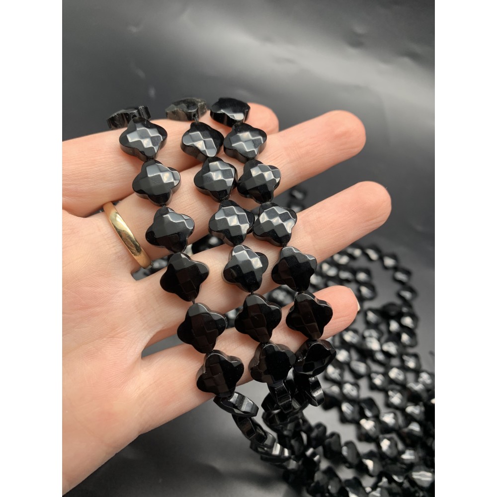 Каменные бусины, Агат чёрный, т.н. "Оникс", клевер, в огранке, 13х6 мм, длина нити 19 см, 15 бусин