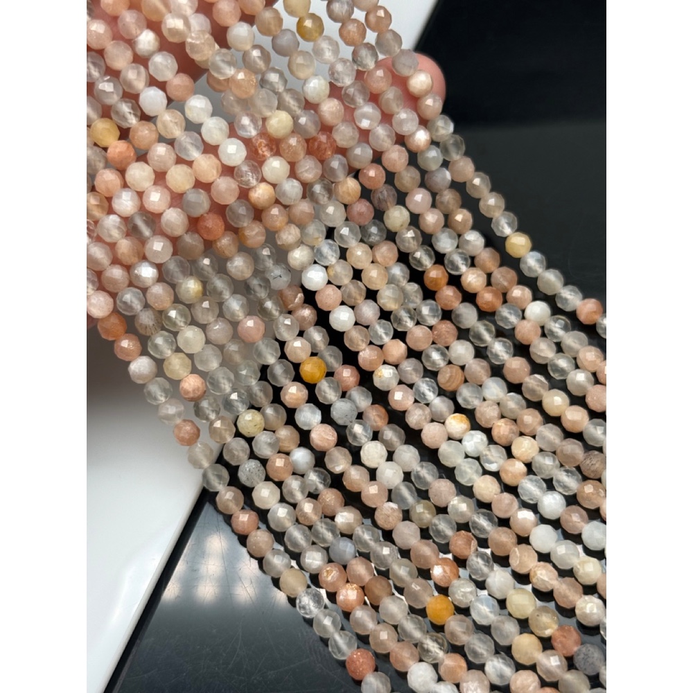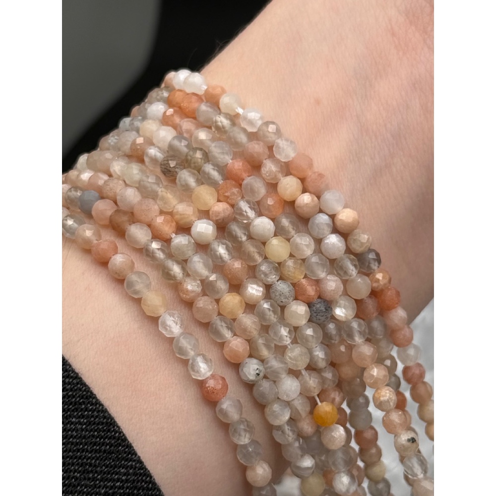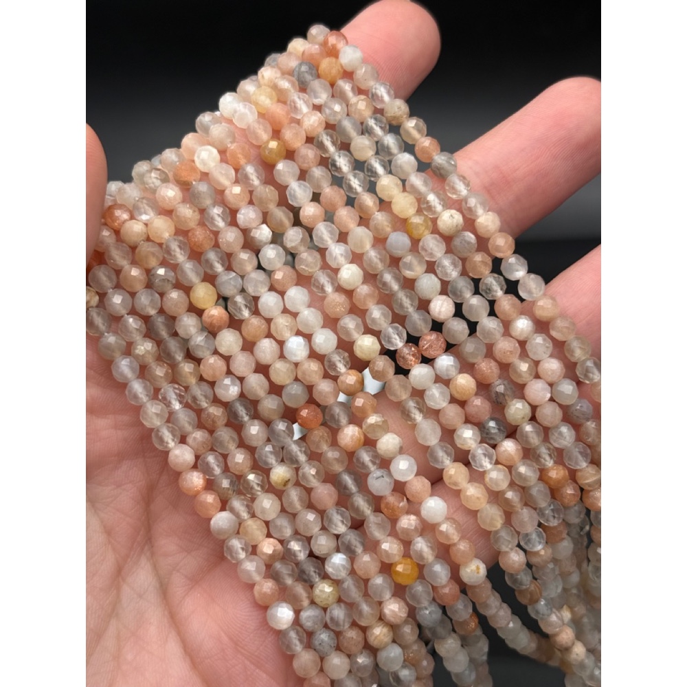 Теги: Каменные бусины, Лунный + Солнечный камень (олигоклаз), микс, шарик огранка, 4 мм, длина нити 38 см, 21694, Бусины в огранке 2-4 мм