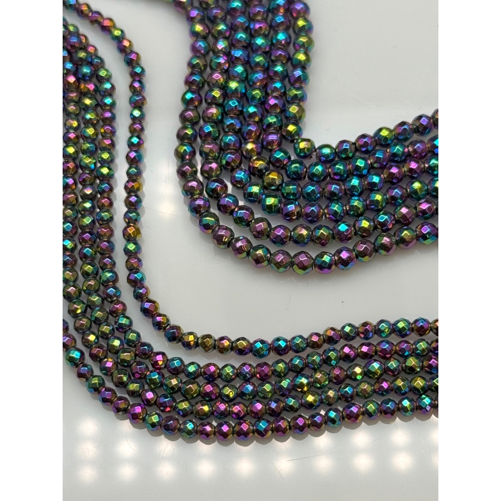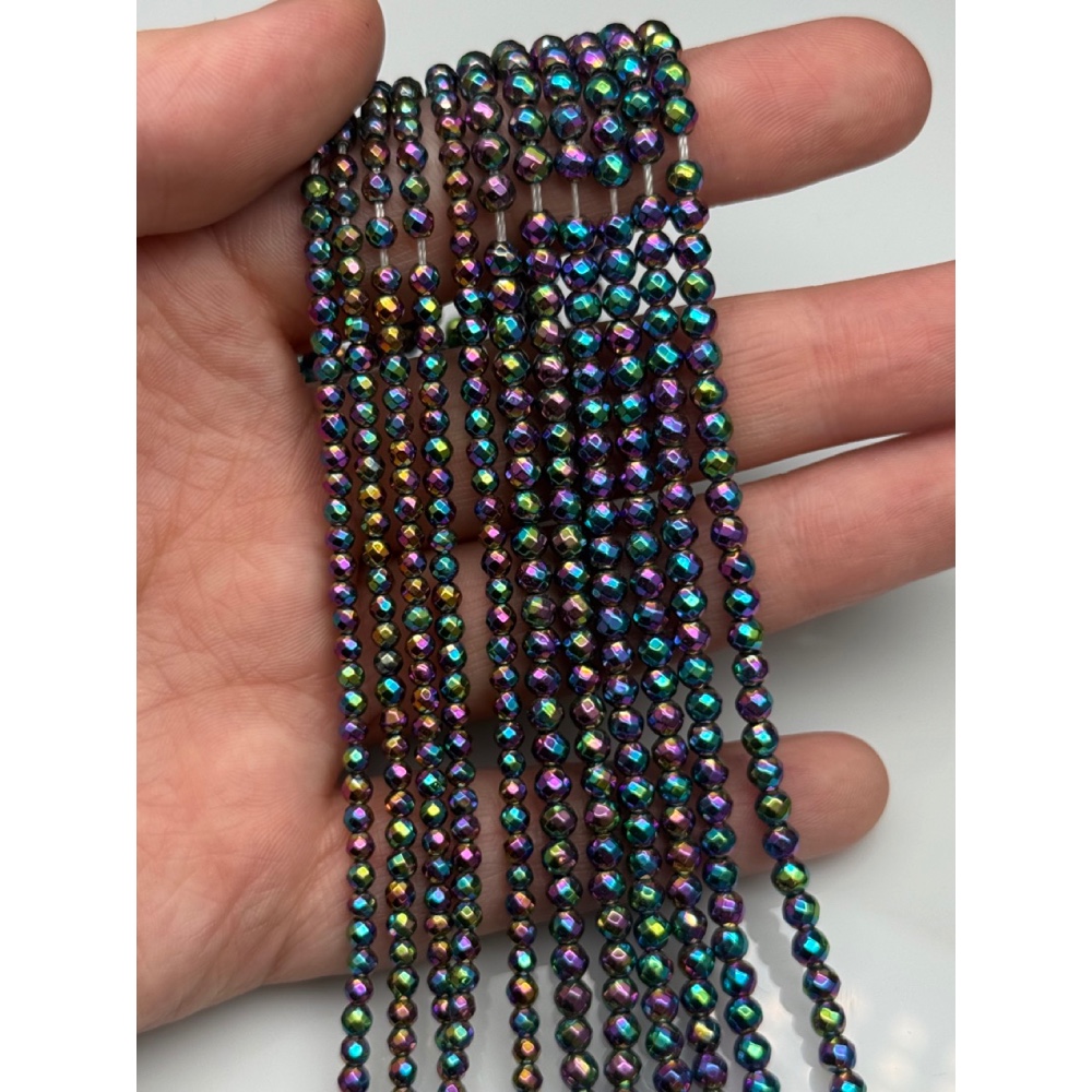 Теги: Каменные бусины, Гематит синтетический, цвет радуга, шарик огранка, размер 3 мм, нить 38 см, 21490, Бусины в огранке 2-4 мм