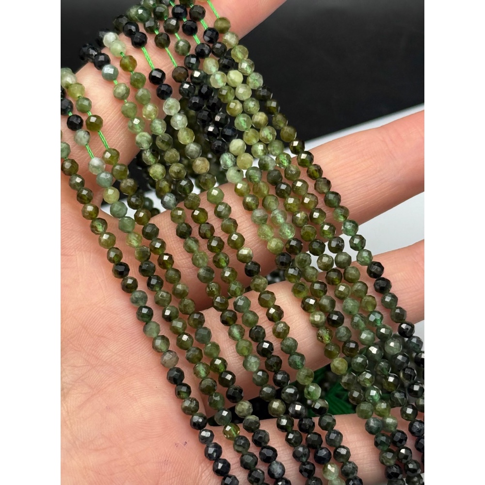 Теги: Каменные бусины, Турмалин, зелёный микс, шарик огранка, 3, 5 мм, длина нити 38 см, 16110, Бусины в огранке 2-4 мм