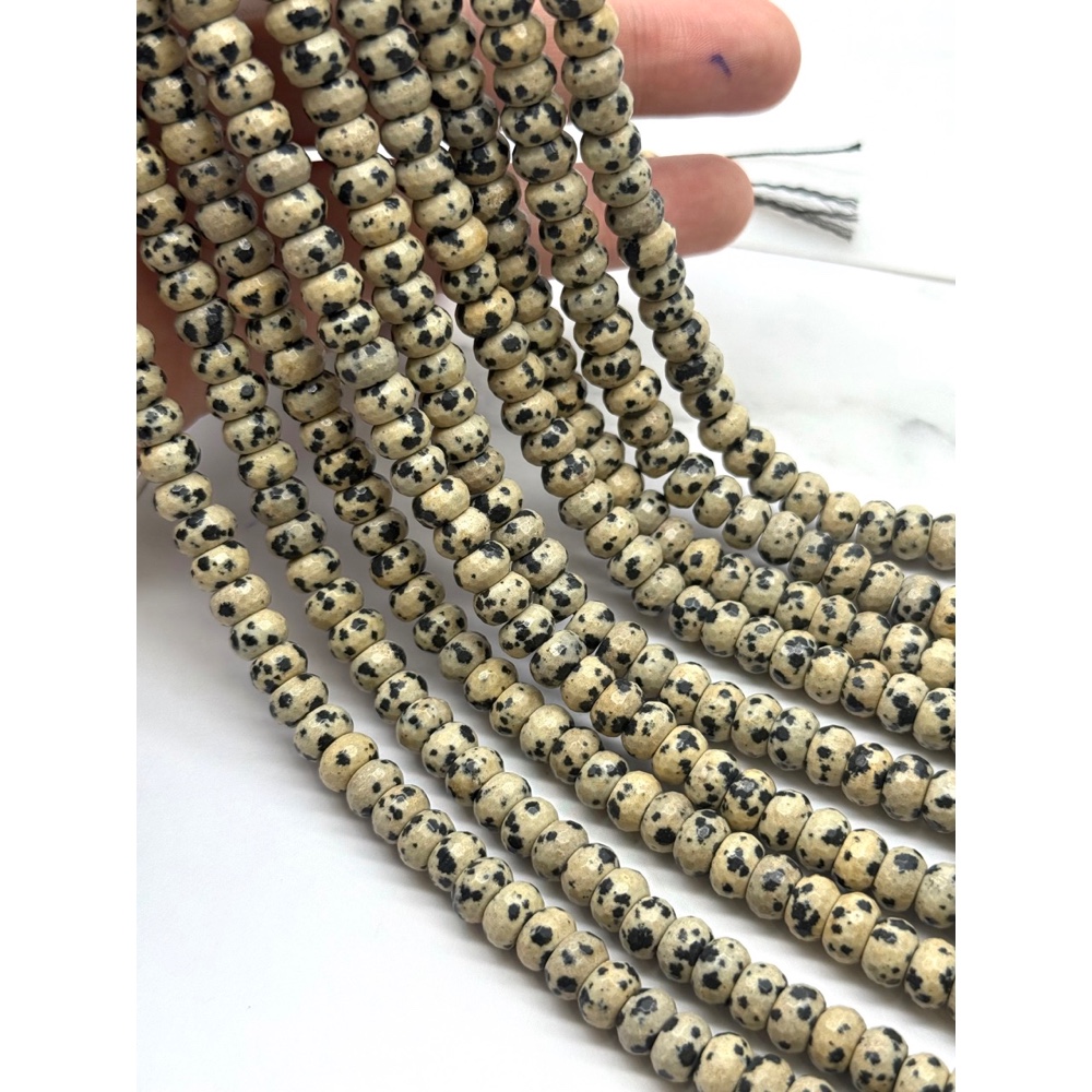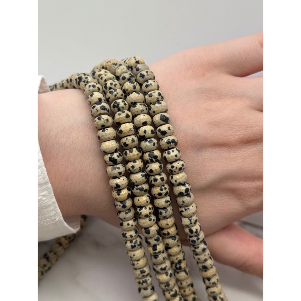 Теги: Каменные бусины, Яшма далматиновая, бублик, рондель, огранка, 8х5 мм, длина нити 40 см, 21033, Бусины в огранке рондель