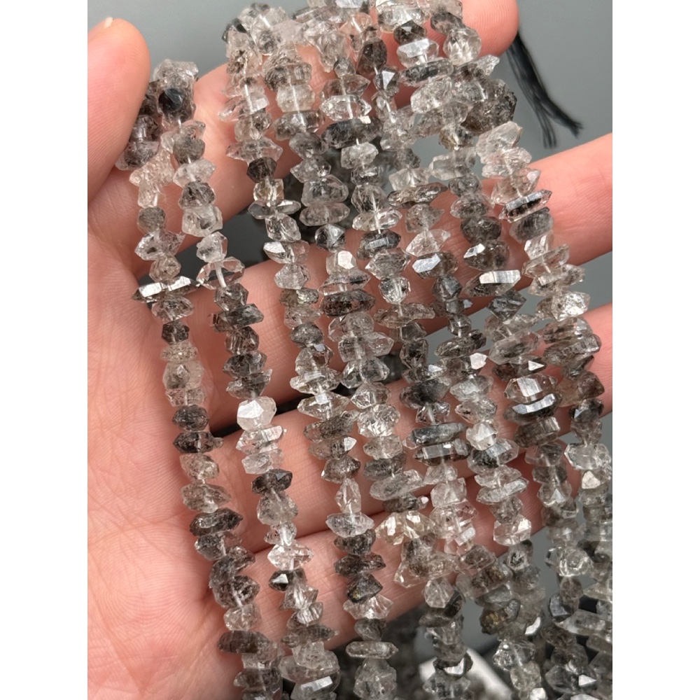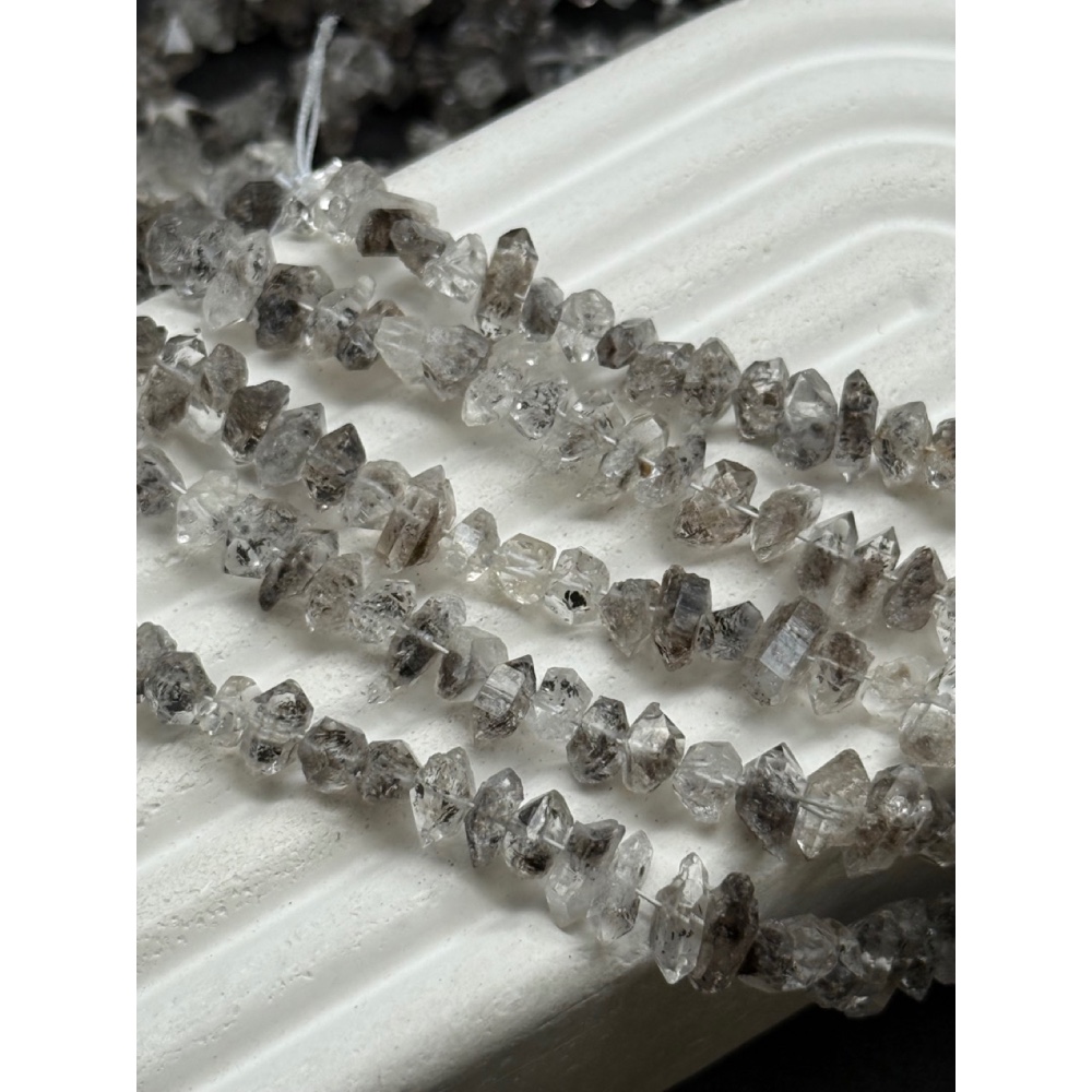 • Каменные бусины, "Херкимерский алмаз", (Двухвершинный кристалл горного хрусталя), с включениями, размер ~8-10х3 мм, длина нити 38 см