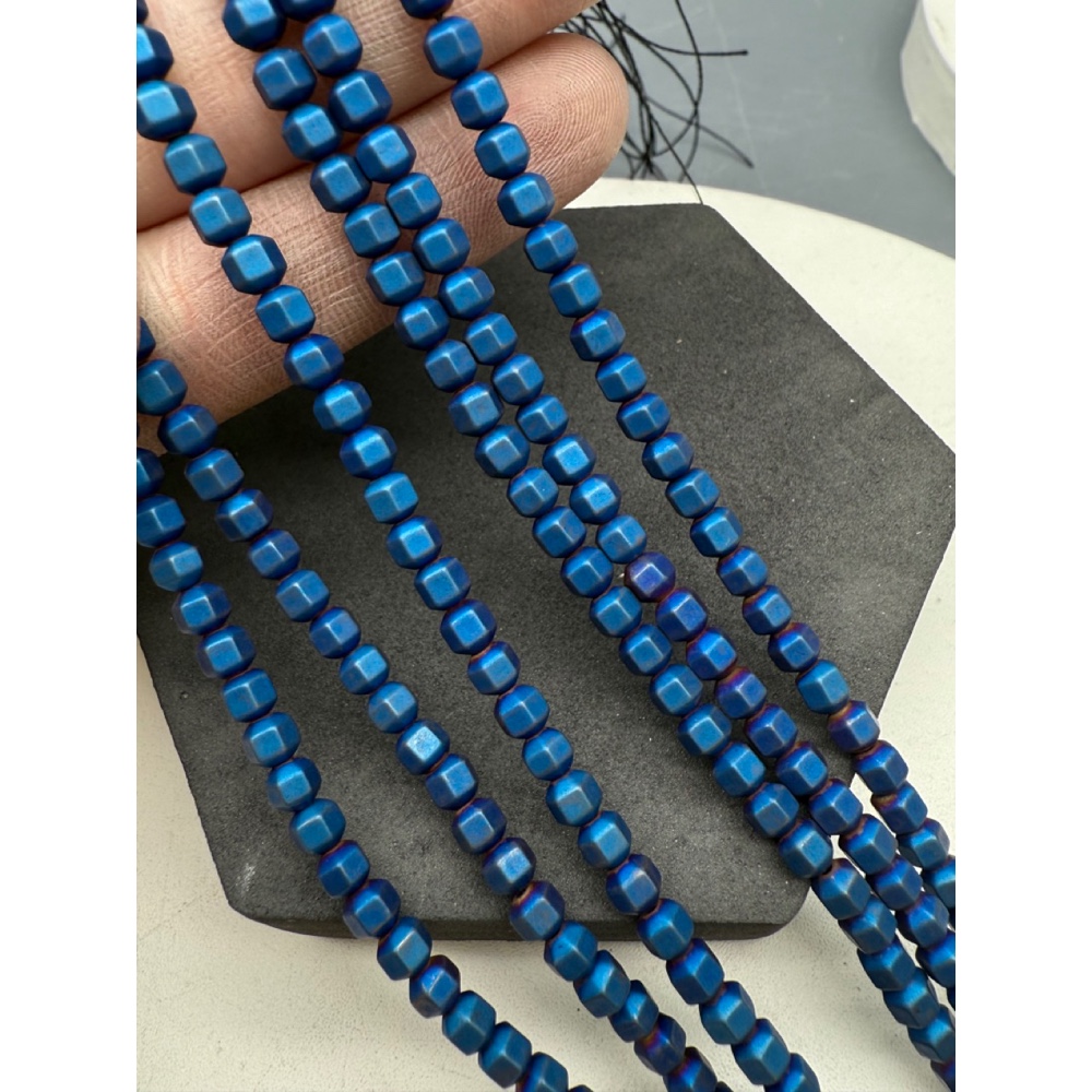 Теги: Каменные бусины, Гематит синтетический, многогранник, синий, матовый, размер 4х4 мм, нить 38 см, 20735, Кубики