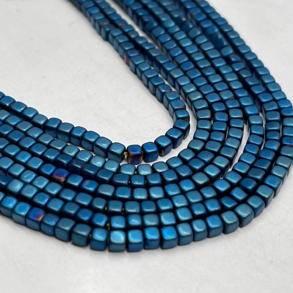 Каменные бусины, Гематит синтетический, синий, матовый, кубик, размер 3х3 мм, нить 38 см