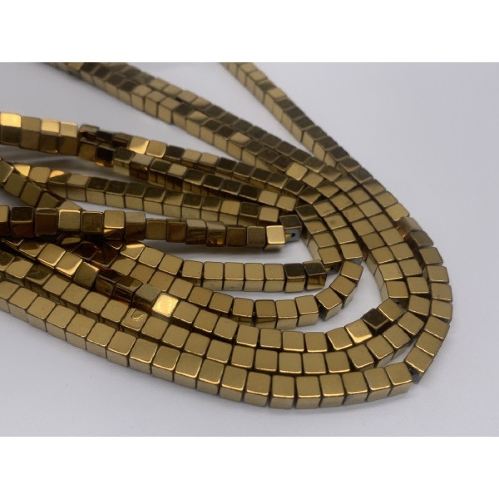 В наличии Код товара: 19521 Каменные бусины, Гематит синтетический, золото, кубик объёмный, размер 2 мм, нить 38 см