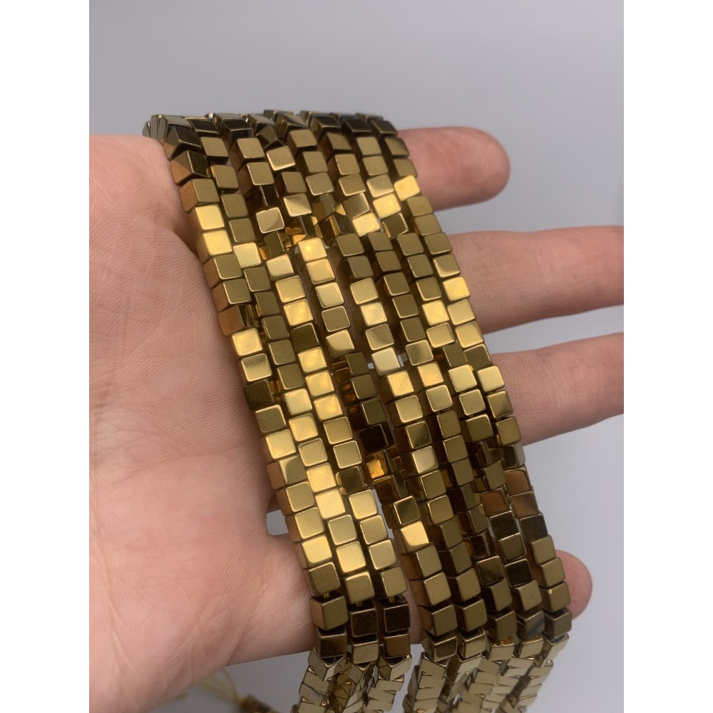 • Каменные бусины, Гематит синтетический, золото, кубик, размер 4х4 мм, нить 38 см