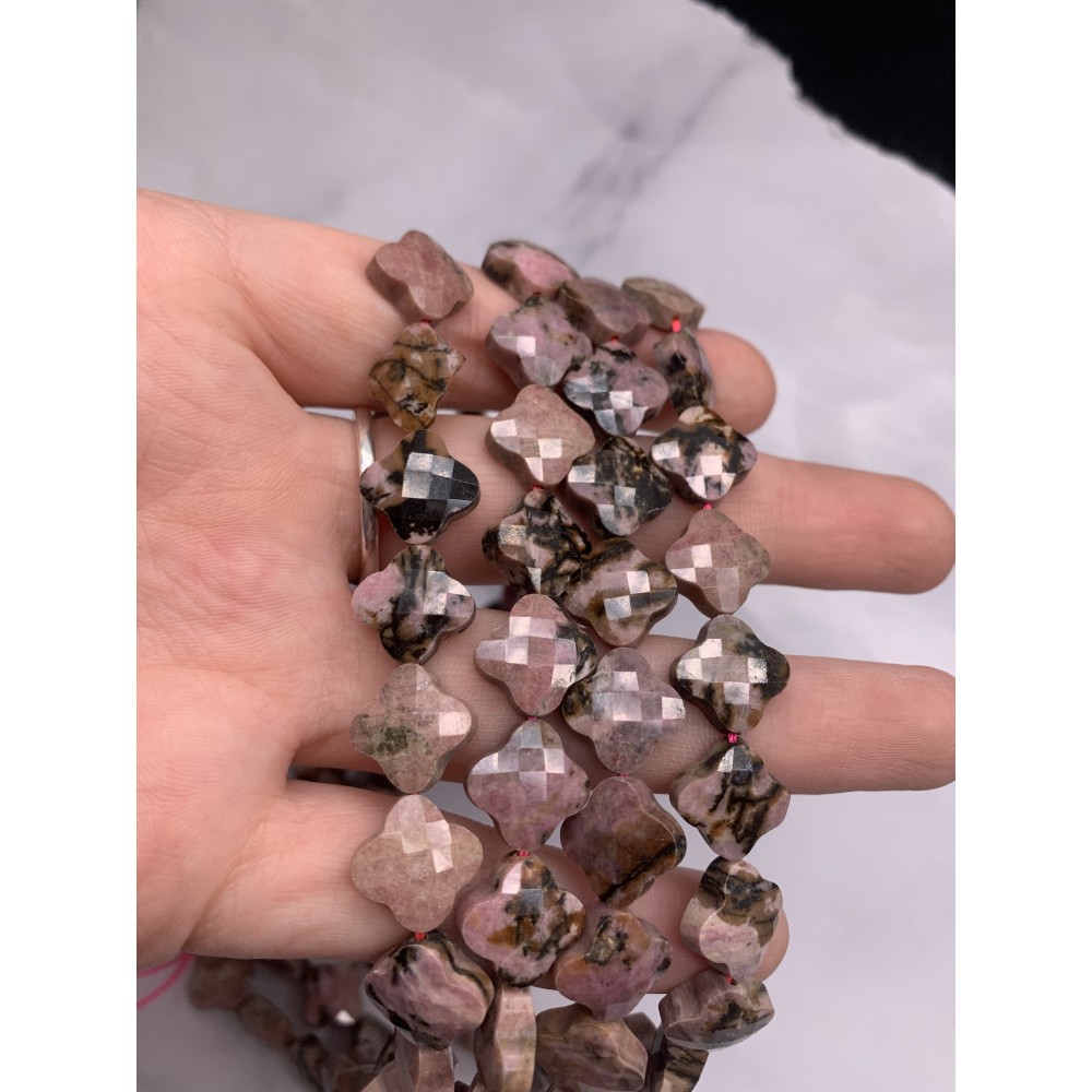 Каменные бусины, Родонит, дендритовый, клевер, в огранке, 13х6 мм, длина нити 38 см, 30 бусин