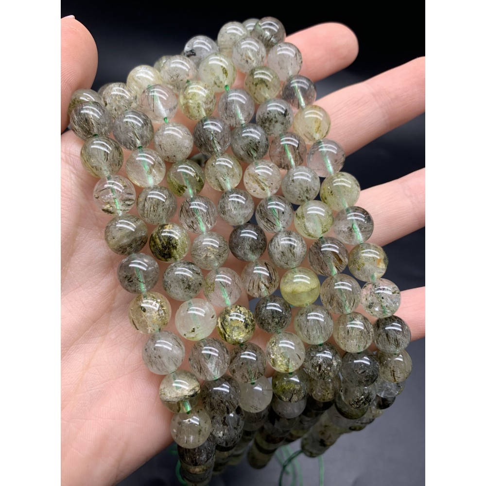 • Каменные бусины, Рутиловый Кварц, Зелёный, шарик, гладкий, 10 мм, длина нити 19 см