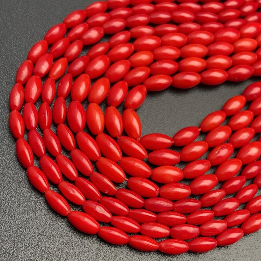 Каменные бусины, Коралл, рис, красный, тонированный, 6х3 мм, длина нити 38 см