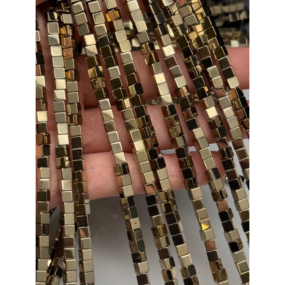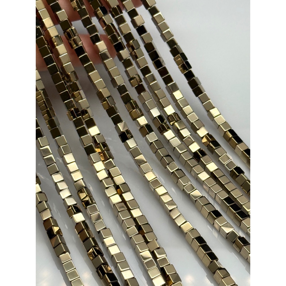 Теги: Каменные бусины, Гематит синтетический, светлое золото, кубик, размер 4х4 мм, нить 40 см, 21641, Гематит (гематин)