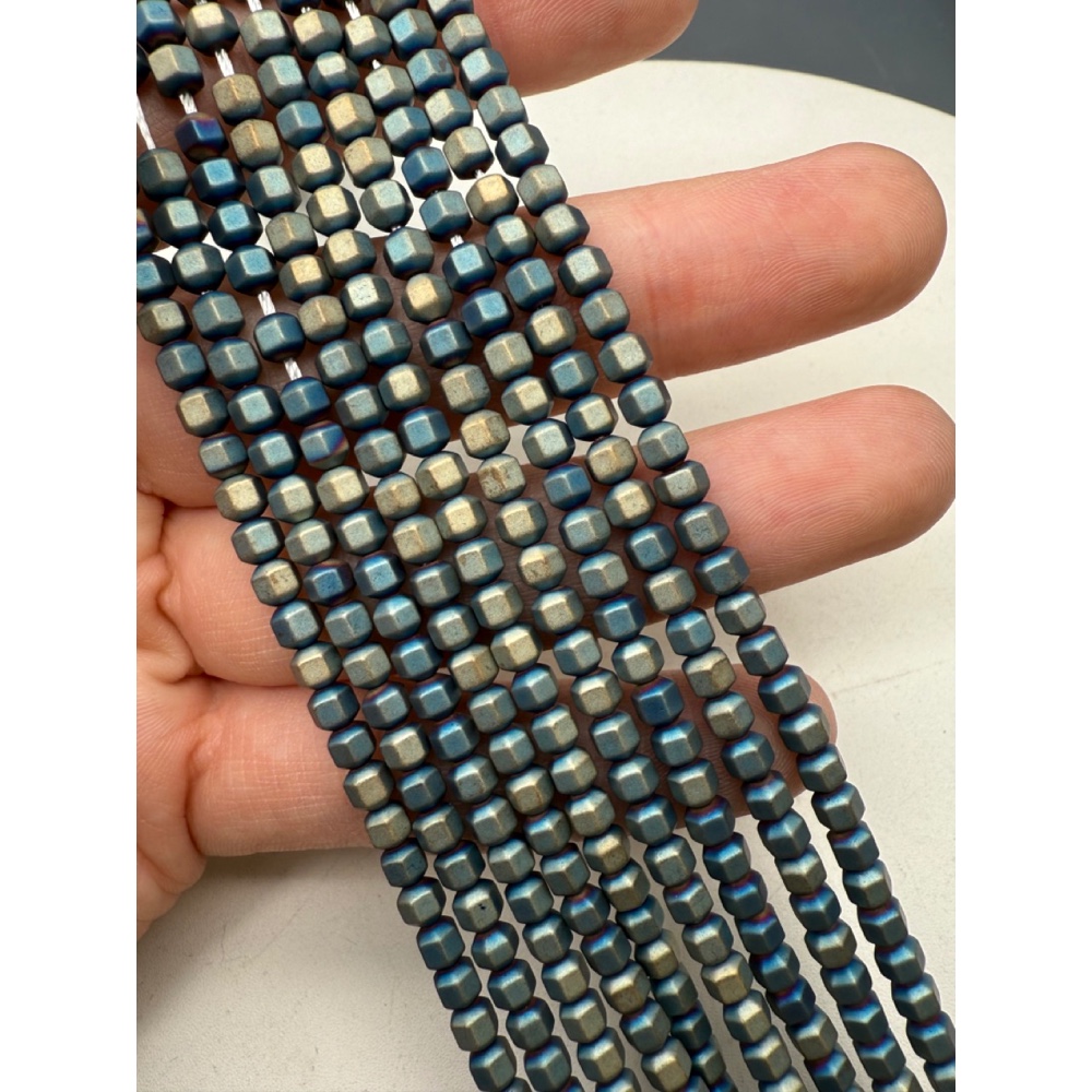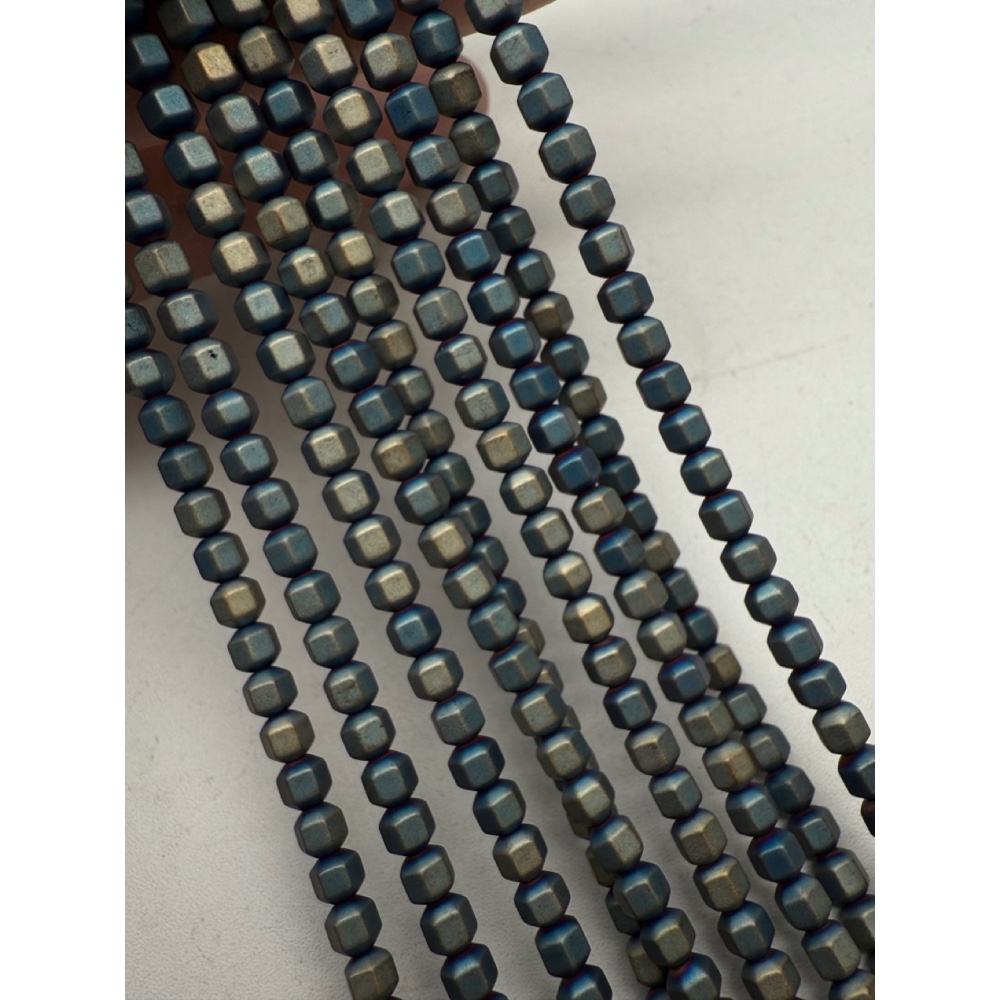 Теги: Каменные бусины, Гематит синтетический, многогранник, голубо-зеленый, матовый, размер 4х4 мм, нить 38 см, 20738, Кубики