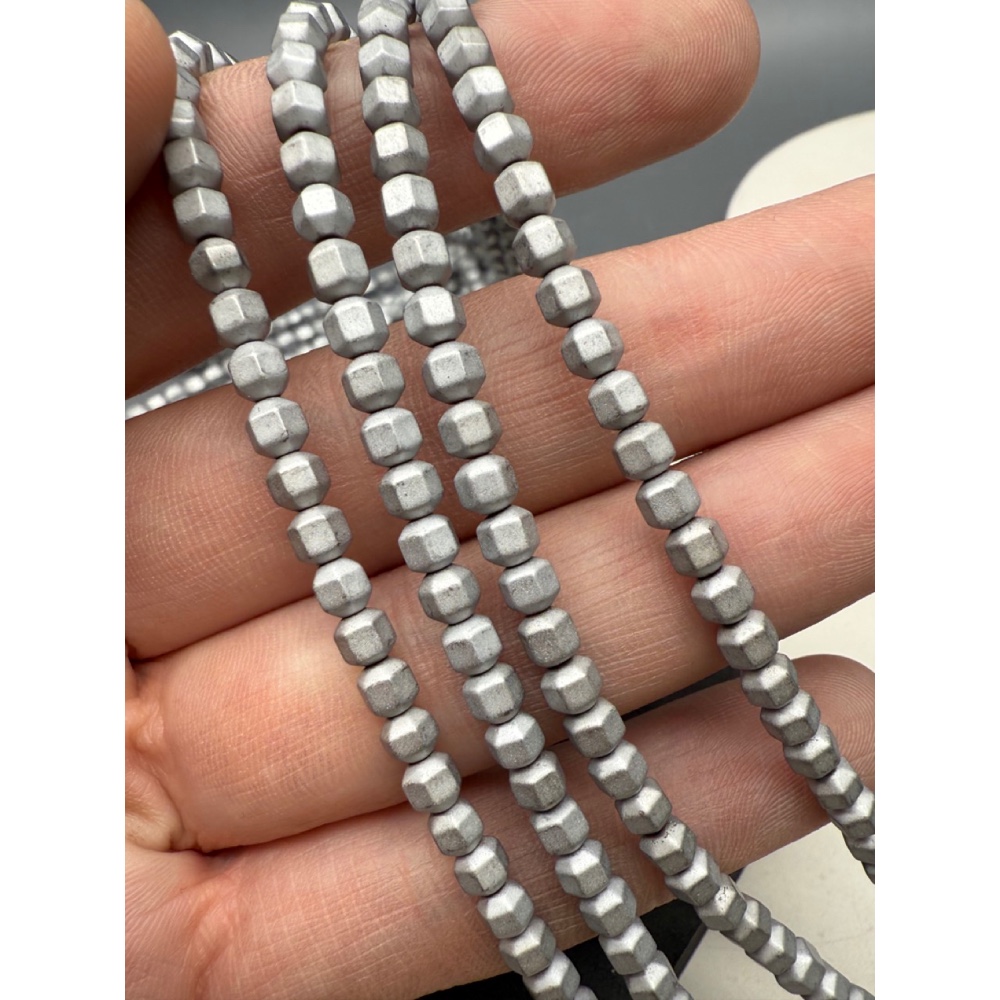Теги: Каменные бусины, Гематит синтетический, многогранник, серебро, матовый, размер 4х4 мм, нить 38 см, 20733, Кубики