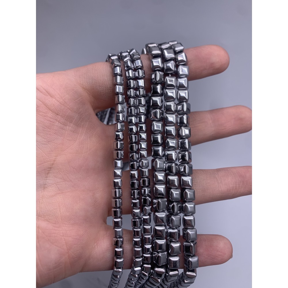 Теги: Каменные бусины, Гематит синтетический, серебро, кубик объёмный, размер 6 мм, нить 38 см, 16984, Кубики