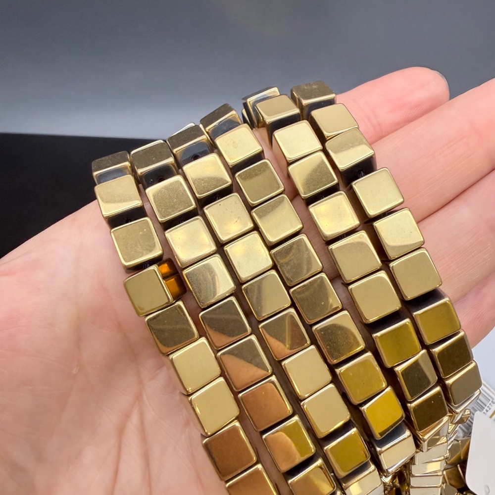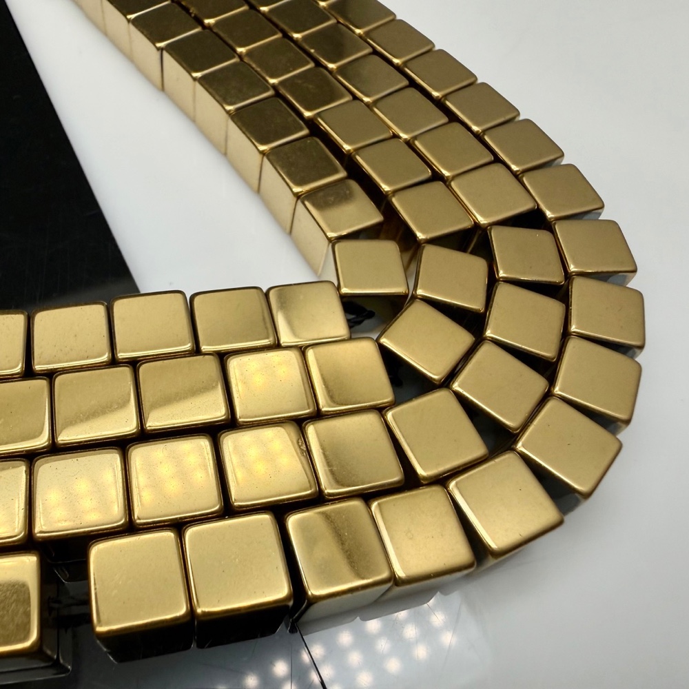 Каменные бусины, Гематит синтетический, золото, кубик, размер 8х8 мм, нить 40 см