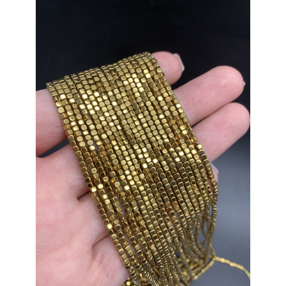 Каменные бусины, Гематит синтетический, золото, кубик, размер 2х2 мм, нить 38 см 15959