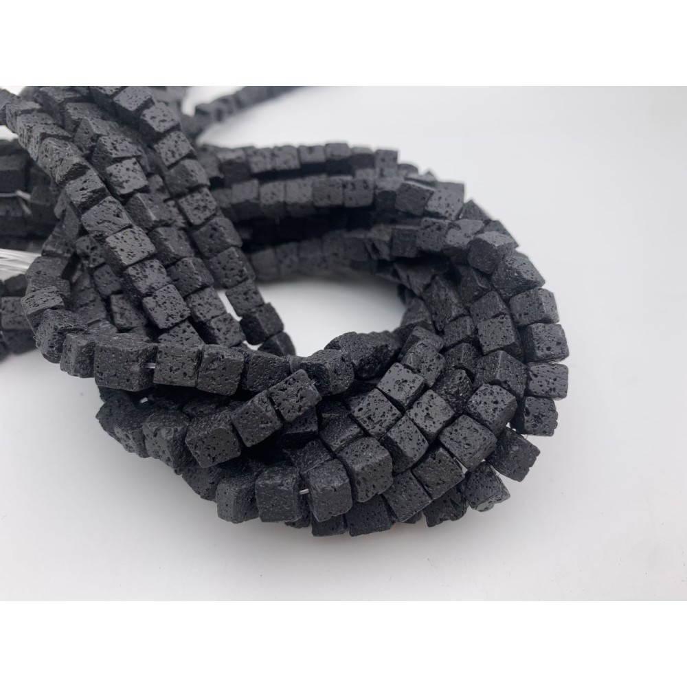 Каменные бусины, Вулканическая лава, черная, кубик 6х6 мм, длина нити 38 см