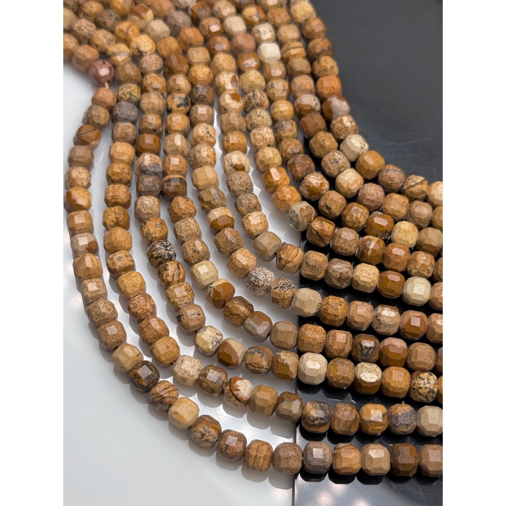 Теги: Каменные бусины, Яшма песочная, кубик, зеркальная огранка, 6х6 мм, длина нити 38 см, 21629, Кубики в огранке