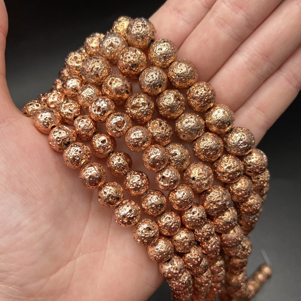 Каменные бусины, Вулканическая лава металлизированная, цвет розовое золото, 10 мм, нить 38 см