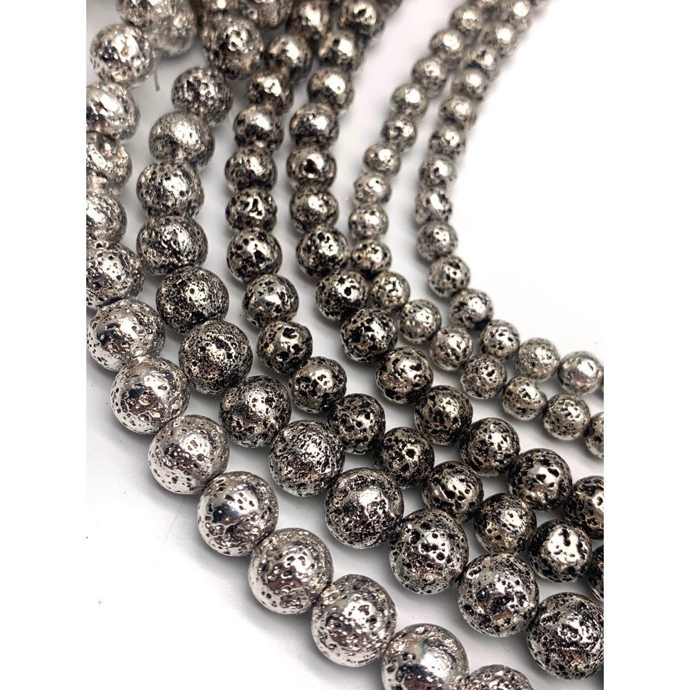 В наличии Код товара: 21699 Каменные бусины, Вулканическая лава металлизированная, цвет светлое серебро, 12 мм, длина нити 38 см