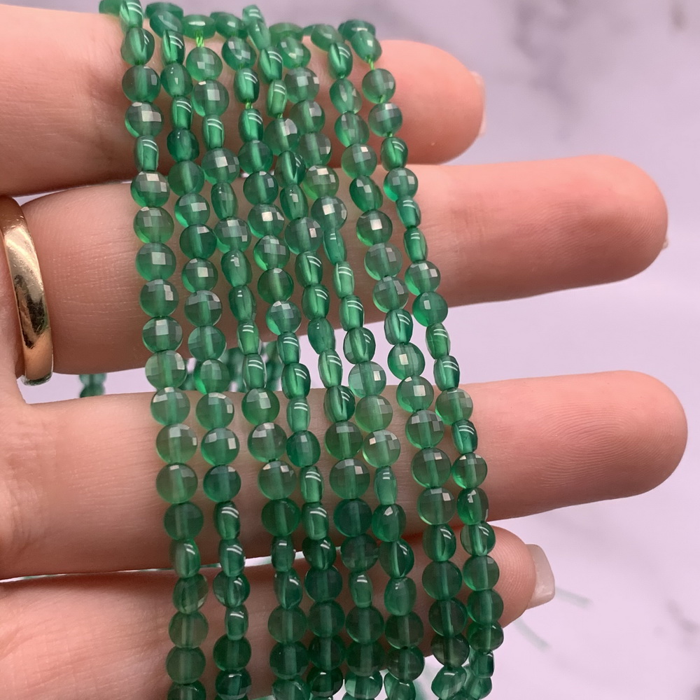 Каменные бусины, Халцедон изумрудный, тонированный, монетка, огранка, 4х2,5 мм, длина нити 38 см