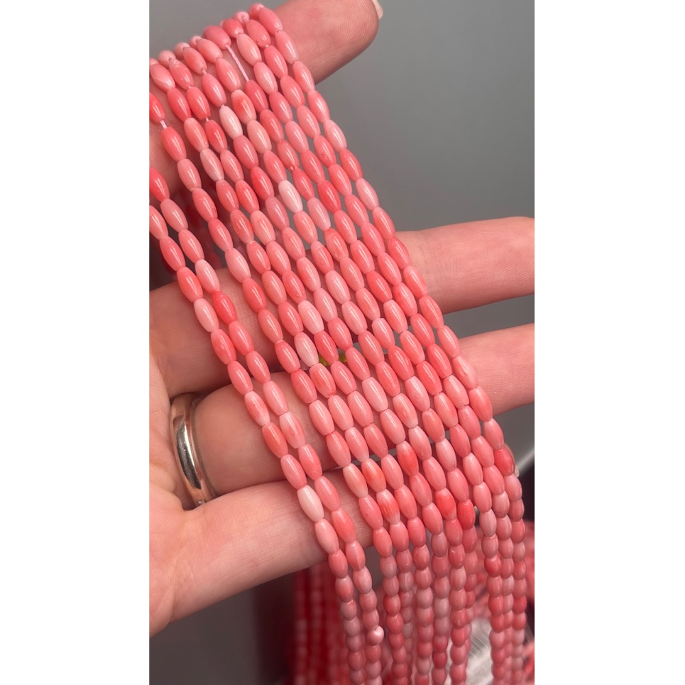 Каменные бусины, Коралл, рис, розовый, тонированный, 6х3 мм, длина нити 38 см