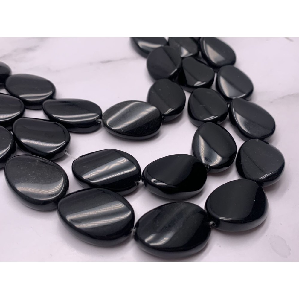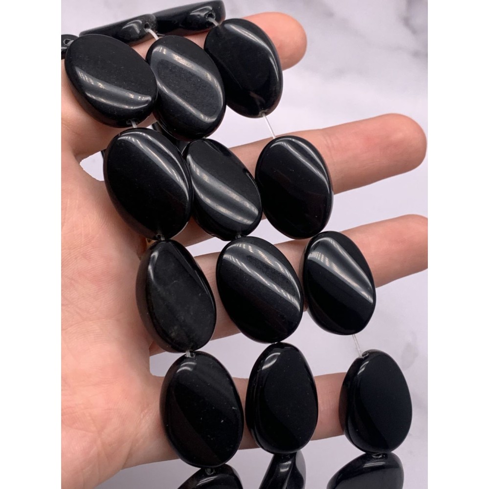 Каменные бусины, Оникс черный люкс, овальные, плоские, 25 x 18 x 7,5 мм, 16 шт. на нити, длина 38 см