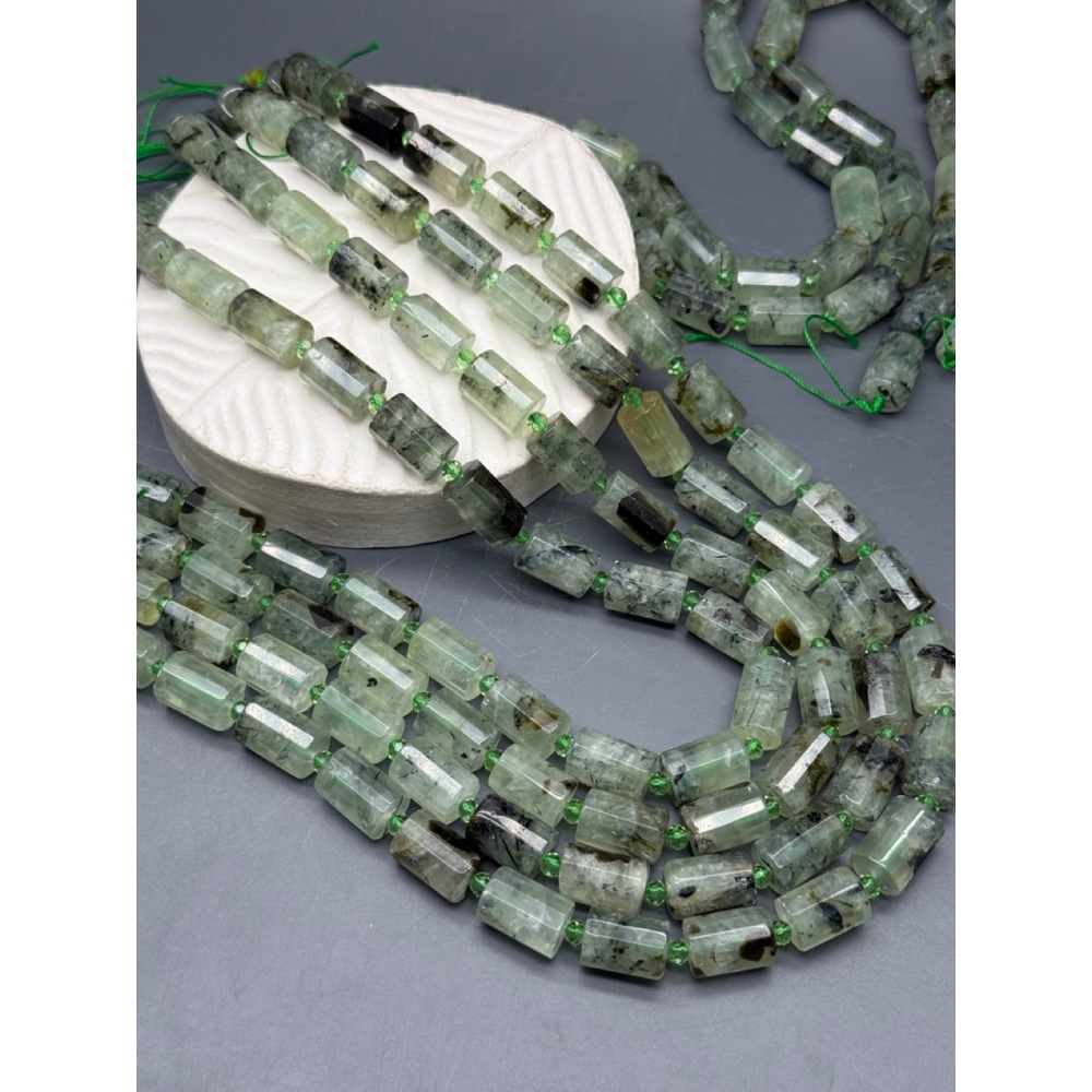 Каменные бусины, Пренит, с включениями, столбики (трубочки), с гранями, размер~15х10 мм, длина нити 38 см 0 1900 ₽