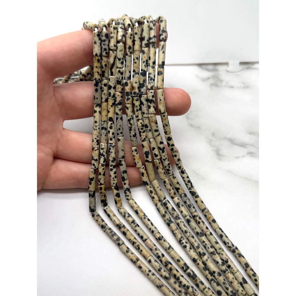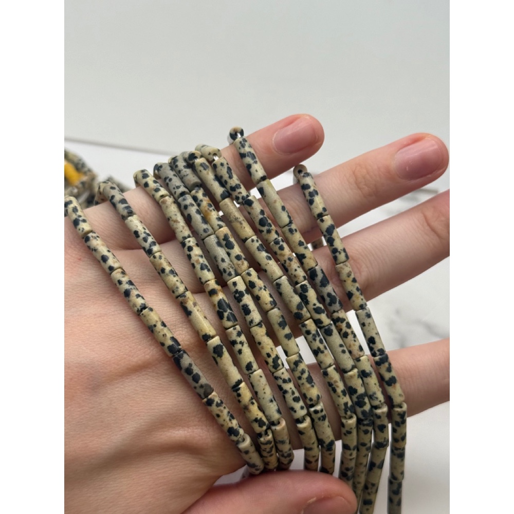 Теги: Каменные бусины, Яшма далматиновая, трубочки, 13х4 мм, длина нити 38 см, 21025, Трубочки, Шайбы, Бублики
