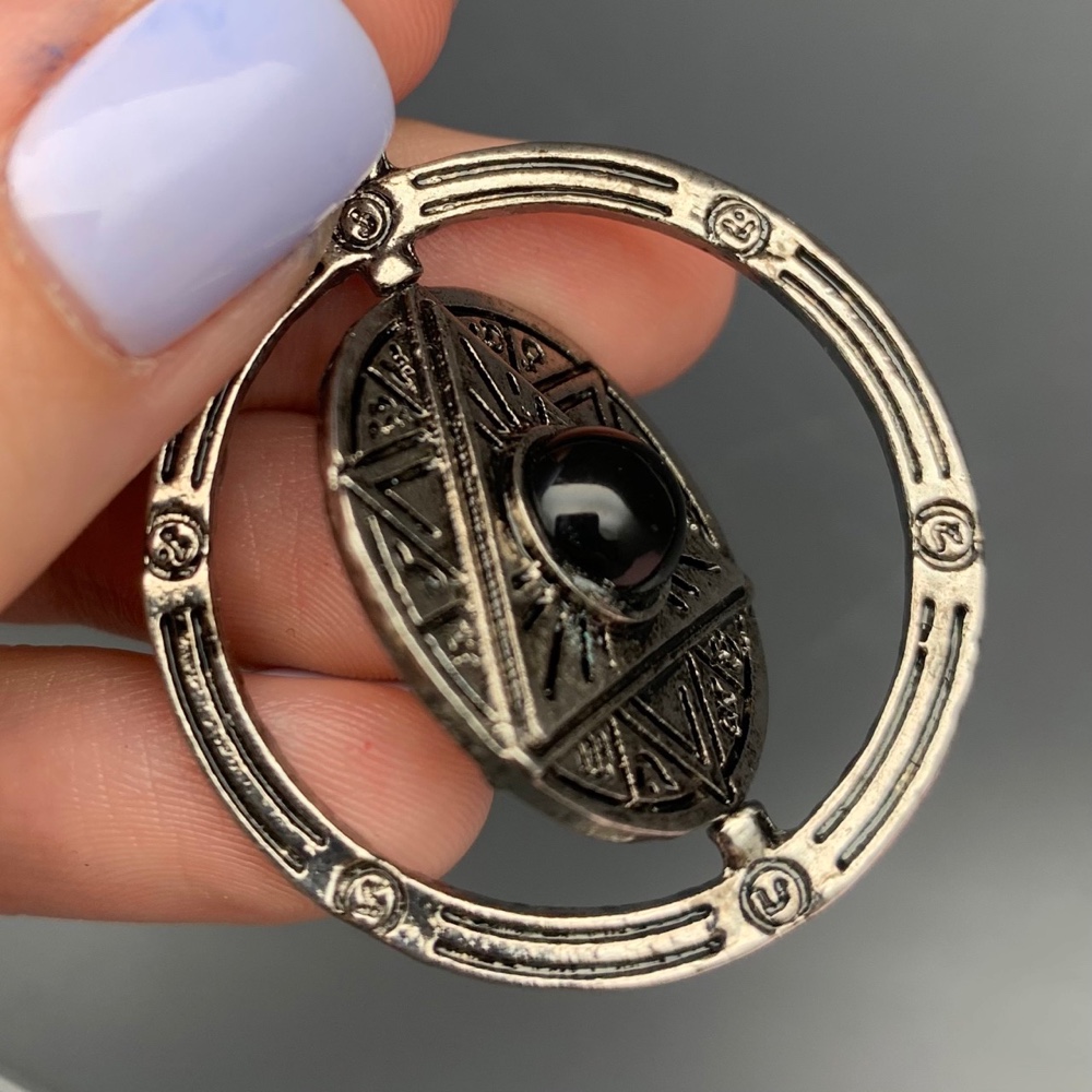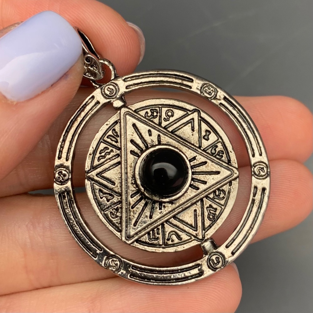 Амулет, Печать Соломона, материал - медный сплав, внутренний круг (диаметр 27 мм) крутится вокруг своей оси, в центре- бусина из натурального камня размером 8 мм.