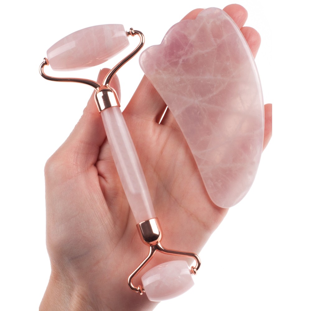 Набор  из розового кварца, Роллер-массажер + скребок "Лапка" для массажа Гуаша, 145 x 55 x 20 мм